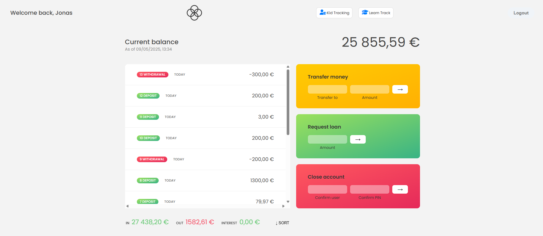 A bank application made by vanilla Javascript and node js express, it has an account management quiz game and kids' track.