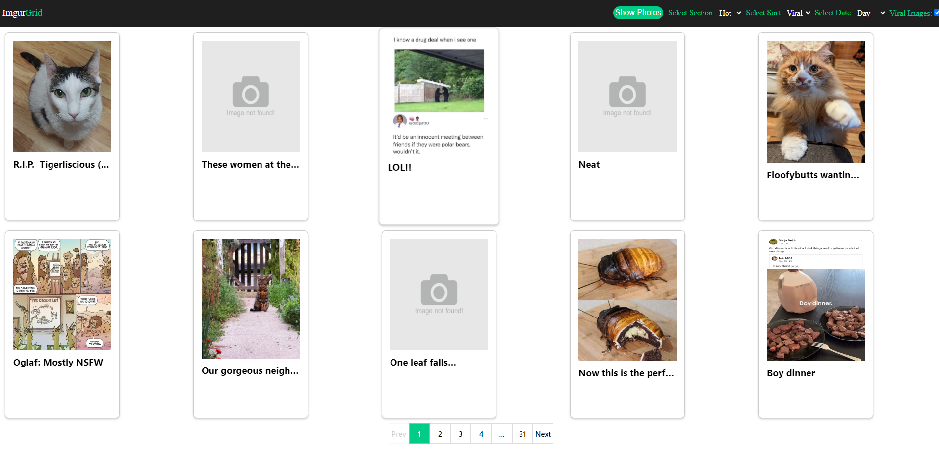Social website of platform imgur, using it's apis im able to show a filtered photos of this platform activity and user interections like likes comments dislikes